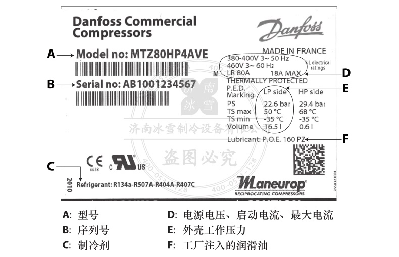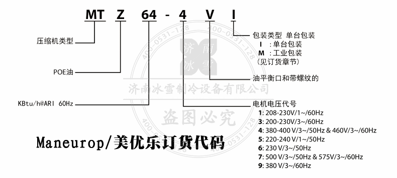 Maneurop/美優樂MT系列,單機設備專門針對冷凍應用的采用 R22 制冷劑的單機配置丹佛斯活塞壓縮機。MT:中高溫,380V/3/60Hz, 專門針對冷凍應用的采用 R22 制冷劑的單機配置丹佛斯活塞壓縮機。 電機電壓代碼 9,380V/3/60Hz。